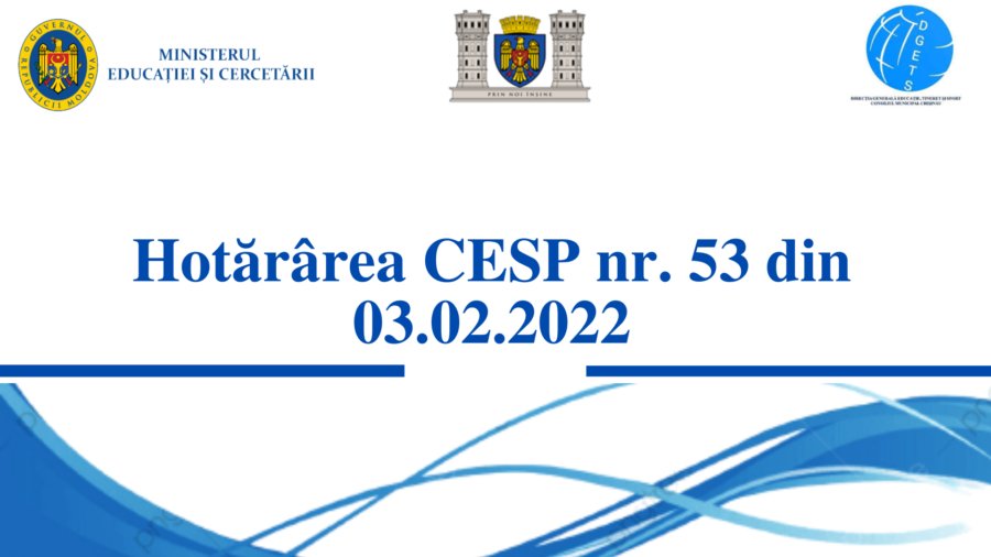 Organizarea procesului educațional pentru elevii din instituțiile de învățământ primar, secundar și special din municipiul Chișinău, începând cu 07 februarie 2022, cu prezență fizică, în contextul expirării, la 04.02.2022, a prevederilor pct. 3 din Hotărârea nr. 2 din 20.01.2022 a Comisiei Naționale Extraordinare de Sănătate Publica. Numărul de elevi prezenți în clasă este stabilit în baza suprafeței sălii de clasă, cu respectarea strictă a normelor de sănătate publica privind prevenirea răspândirea SARS CoV-2.